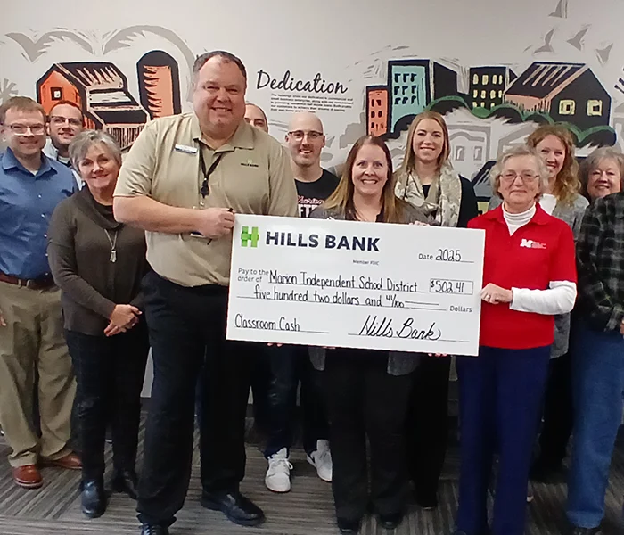 Hill’s Bank donated $502.41 to the Marion Independent School Foundation as part of their Classroom Cash Program. Since 2004, Classroom Cash has contributed $22,202.96 to help students in the Marion Independent School District. Thank you for your support, Hills Bank!